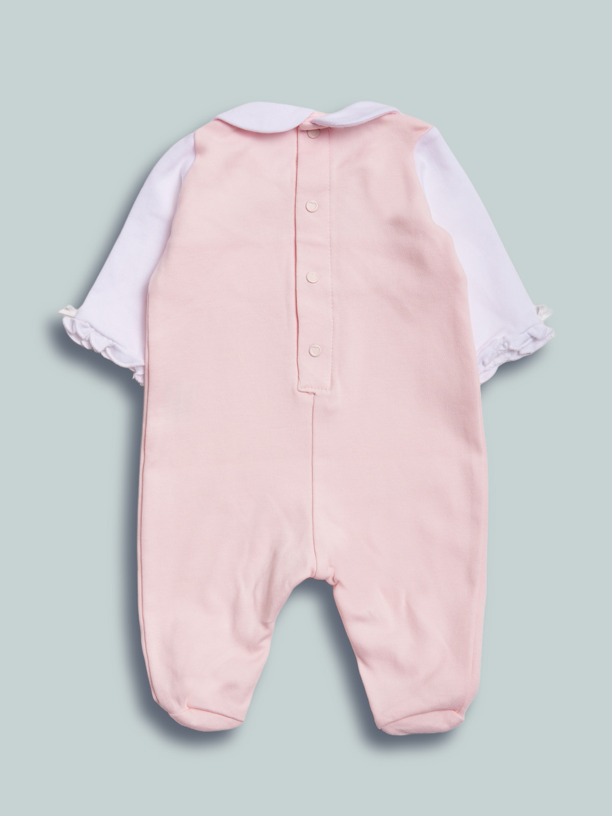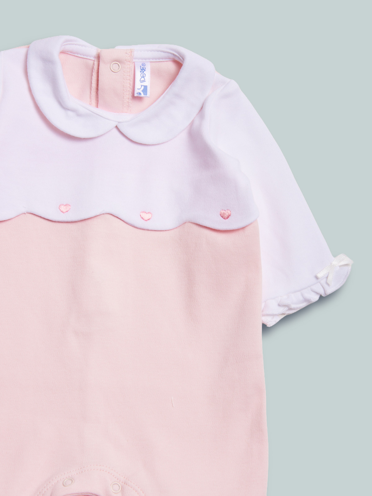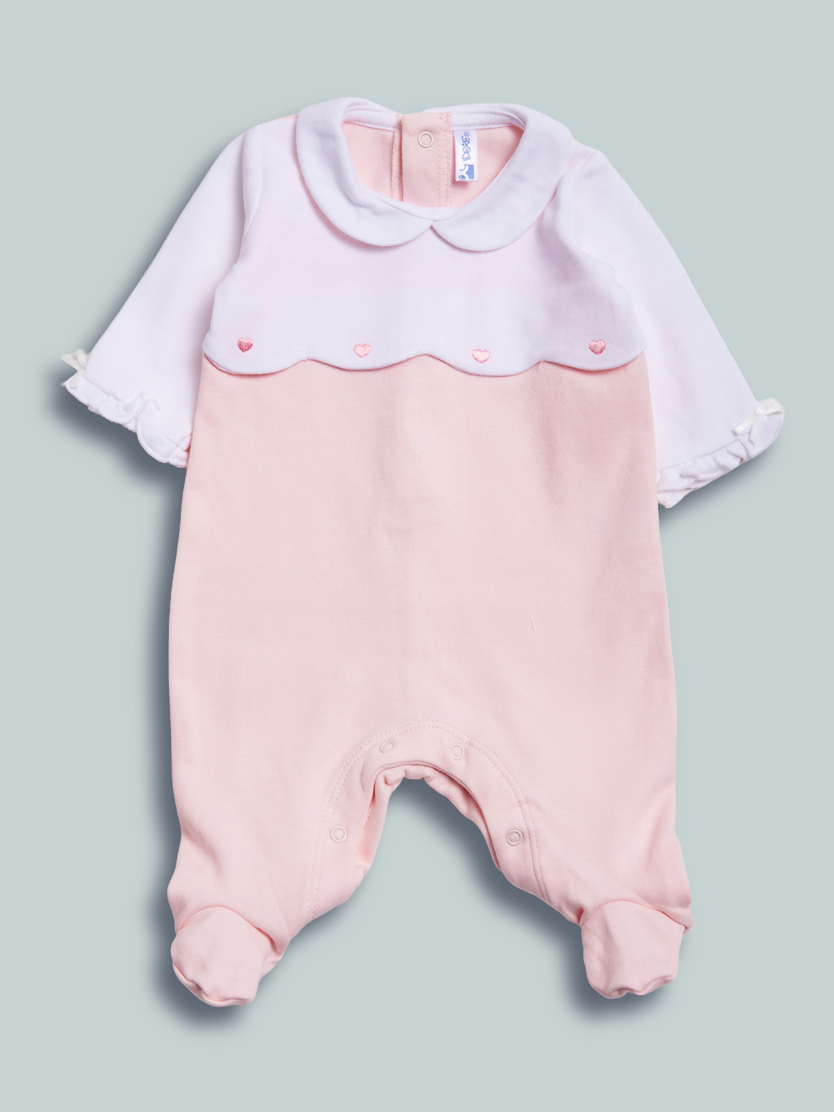 Tutina caldo cotone bicolore, collo rotondo, taglio davanti ad ondine con delicati cuoricini rendono il capo molto femminile. Apertura dietro ed entrogamba con bottoni a pressione per agevolarne l’indosso. Un capo funzionale ed alla moda, che non può mancare nell’armadio delle vostre neonate.