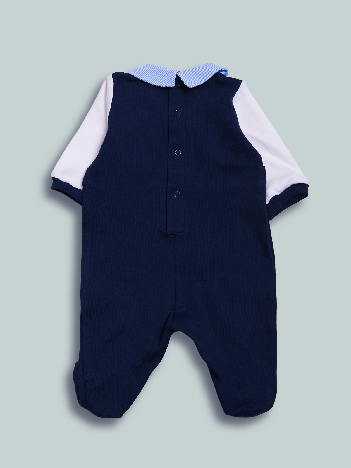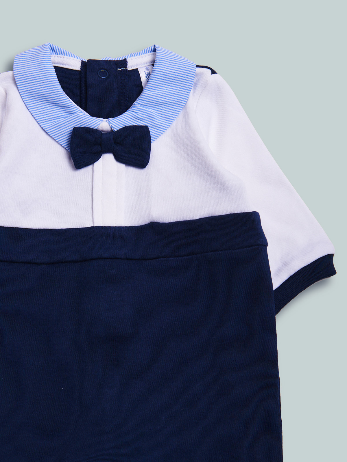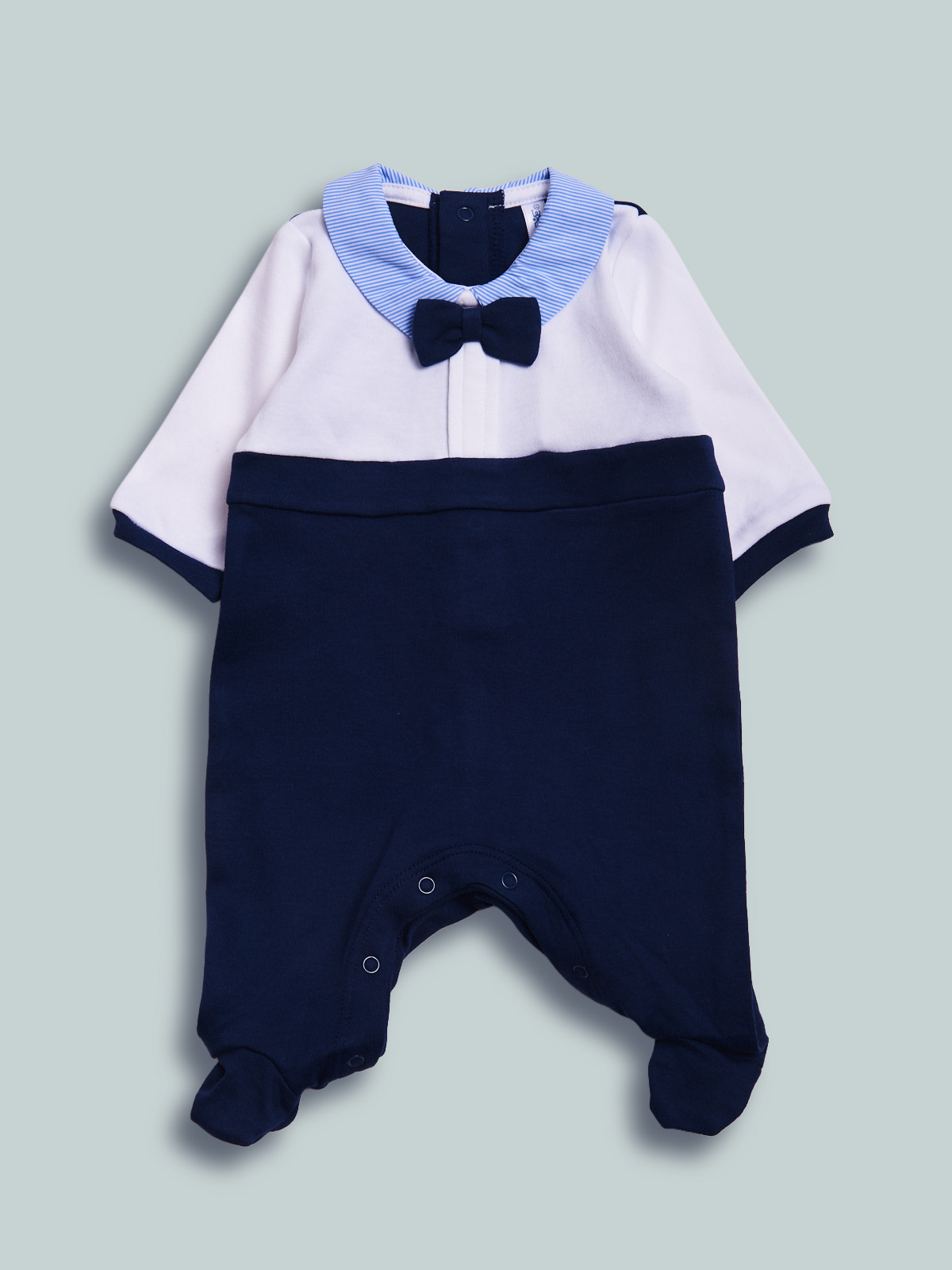 Tutina manica lunga dalla linea classica ed elegante in caldo cotone. Colletto modello camicia con papillon. Chiusura con bottoni a pressione per agevolarne l’indosso. Pigiamino da indossare nelle occasioni speciali.