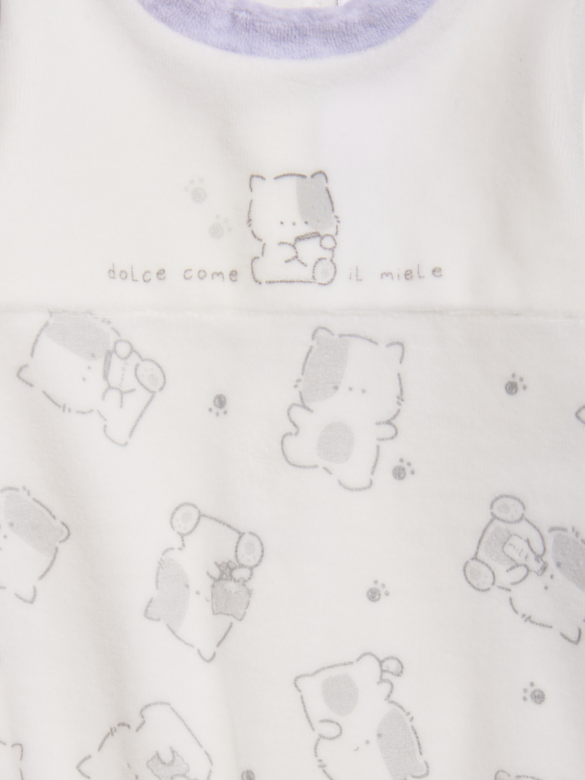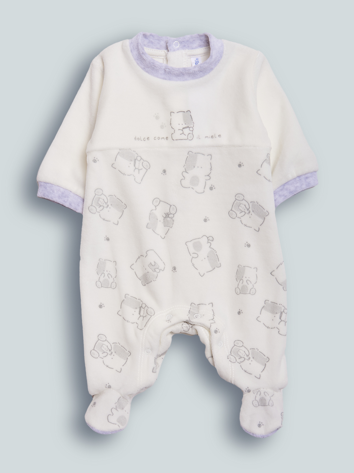 Pigiama manica lunga per neonato. Girocollo serafino. Chiusura con bottoni a pressione per agevolarne l’indosso. Soffice ciniglia latte e fantasia per tenere al caldo il nostro neonato. Questo pigiamino fa parte del corredino composto da tutti gli articoli indispensabili per il tuo neonato.