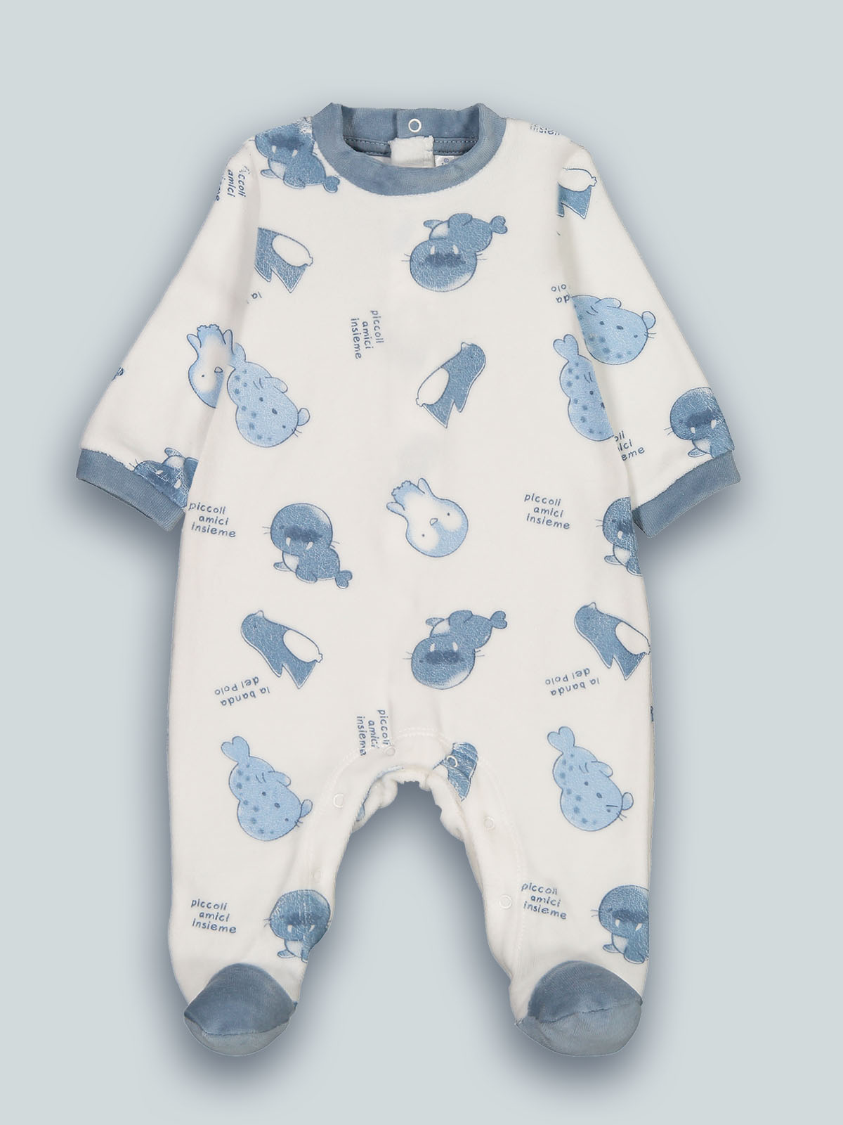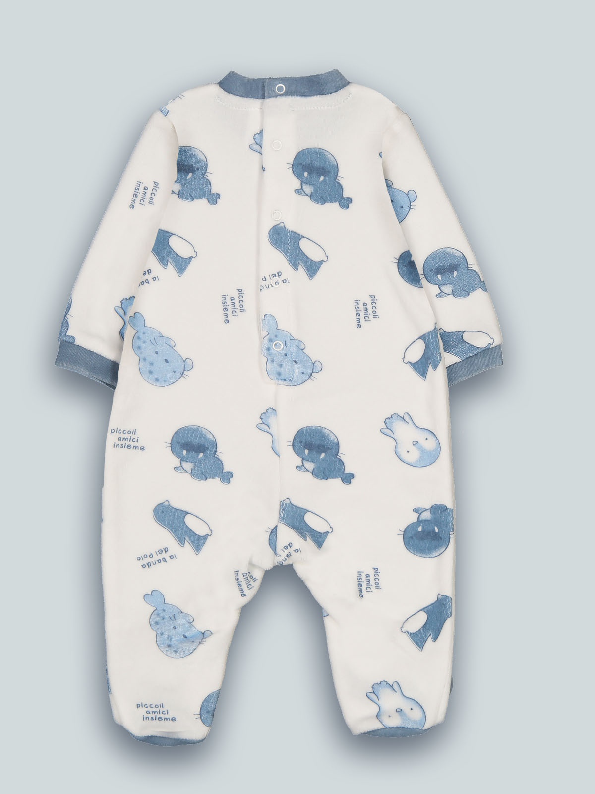 Tutina a maniche lunghe in ciniglia stampata fantasia. La vestibilità è morbida e pratica grazie a bottoni a pressione sul retro e sul cavallo. Questo pigiama fa parte del corredino composto da tutti gli articoli indispensabili per il tuo neonato.