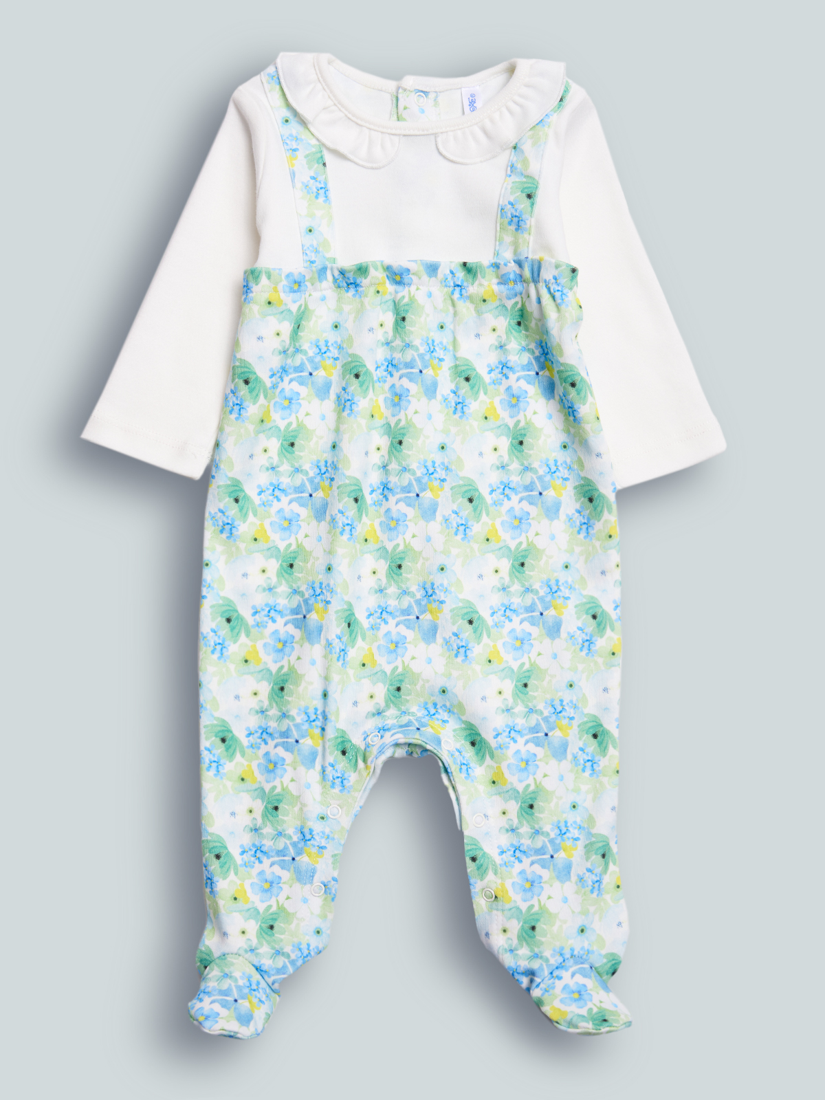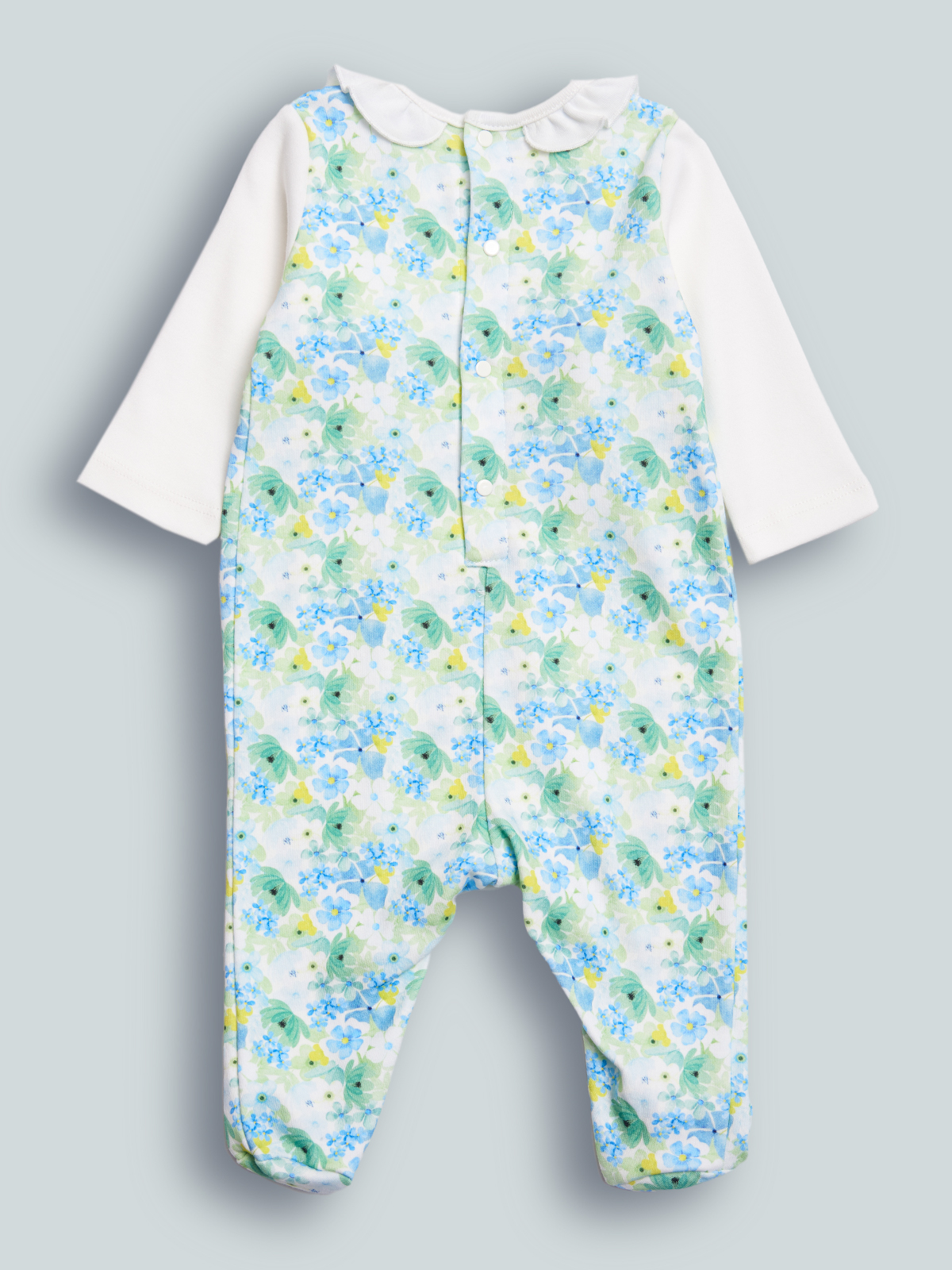 Tutina in caldo cotone stampato fantasia floreale, particolari in unito. Taglio davanti arricciato e girocollo con rouches aggiunge un tocco femminile. Apertura dietro ed entrogamba con bottoni a pressione. Una tutina pratica e carina per la vostra neonata.
