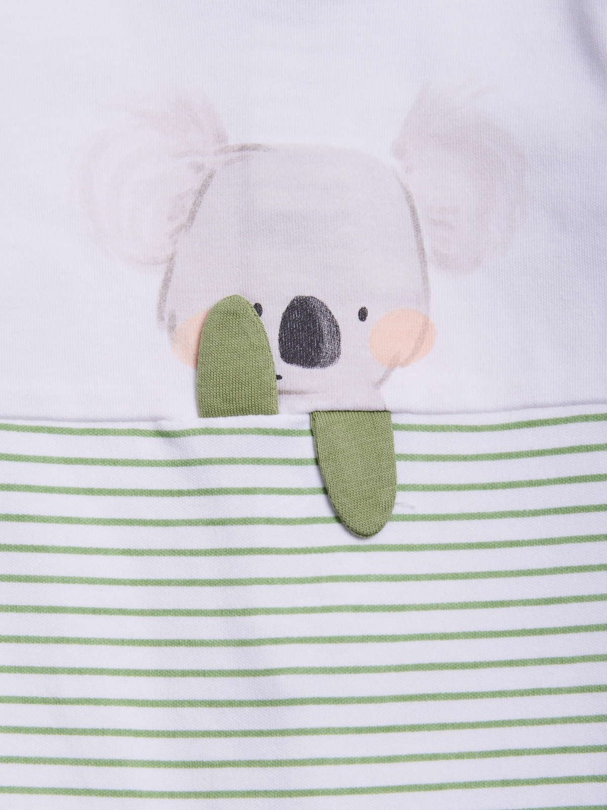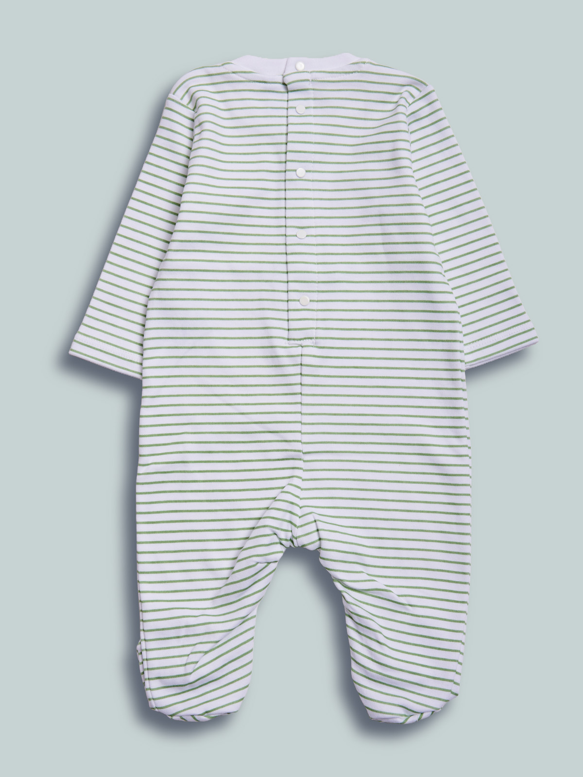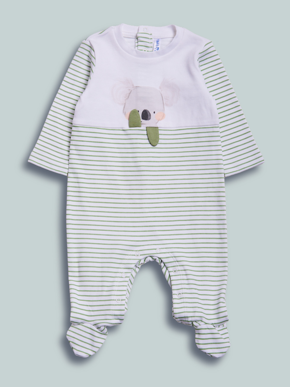 Tutina in morbido cotone stampato rigato, parte superiore davanti unito con sipamatica stampa con particolari 3D per far divertire in vostro neonato! Oltre all’apertura sul retro, presenta una comoda apertura entrogamba per facilitare il cambio.