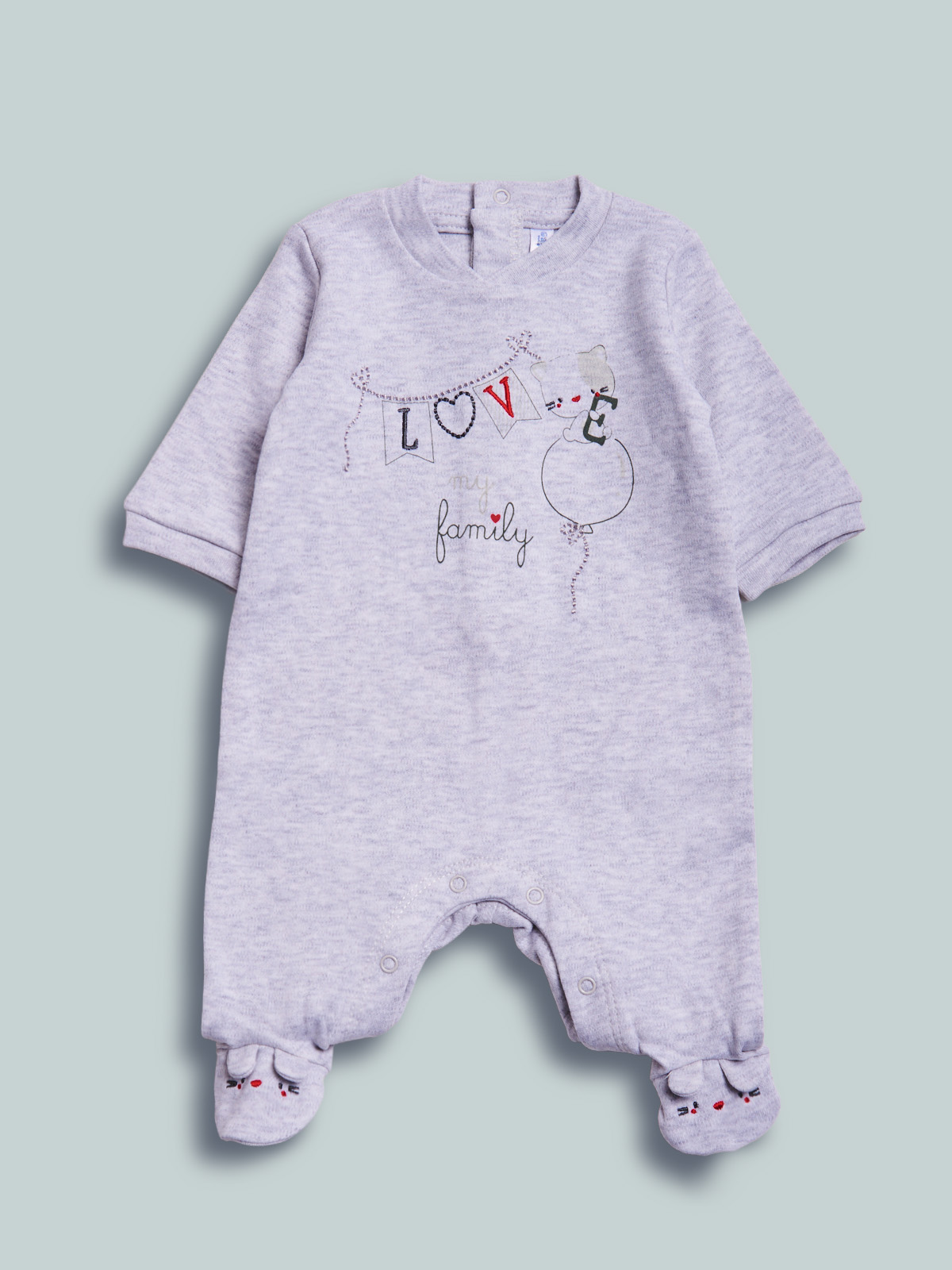 Pigiama in caldo cotone manica lunga con piedino, apertura dietro ed entrogamba con bottoni a pressione per agevolarne l’indosso. Elemento decorativo: tenera stampa e ricamo davanti. Ideale per la nanna.