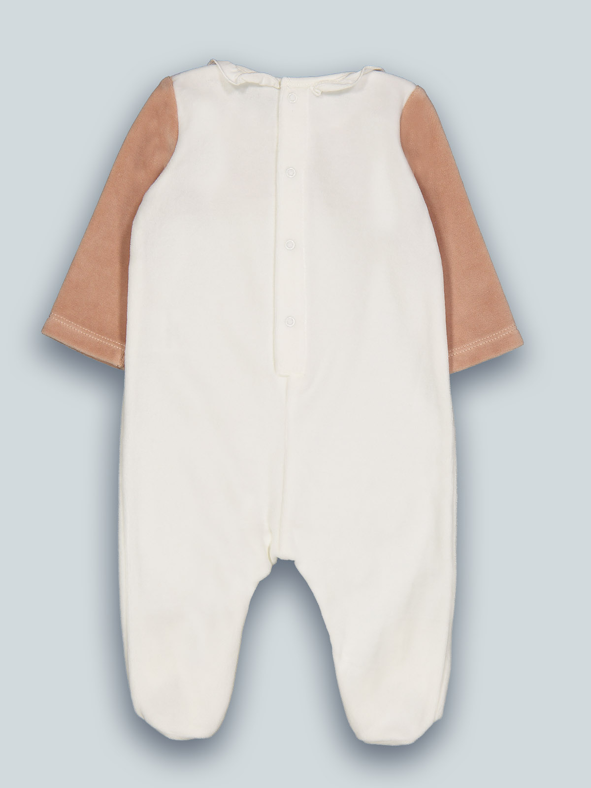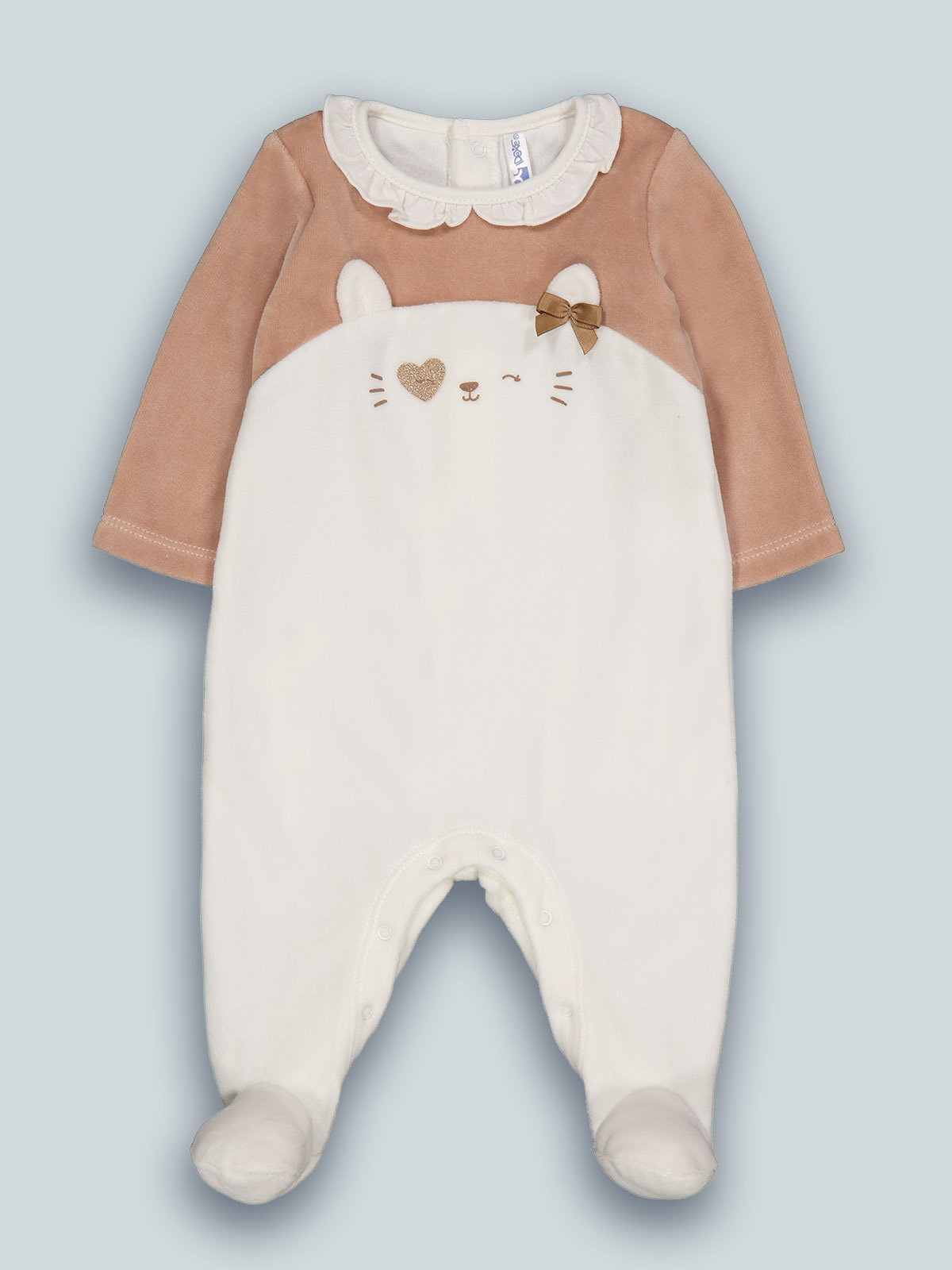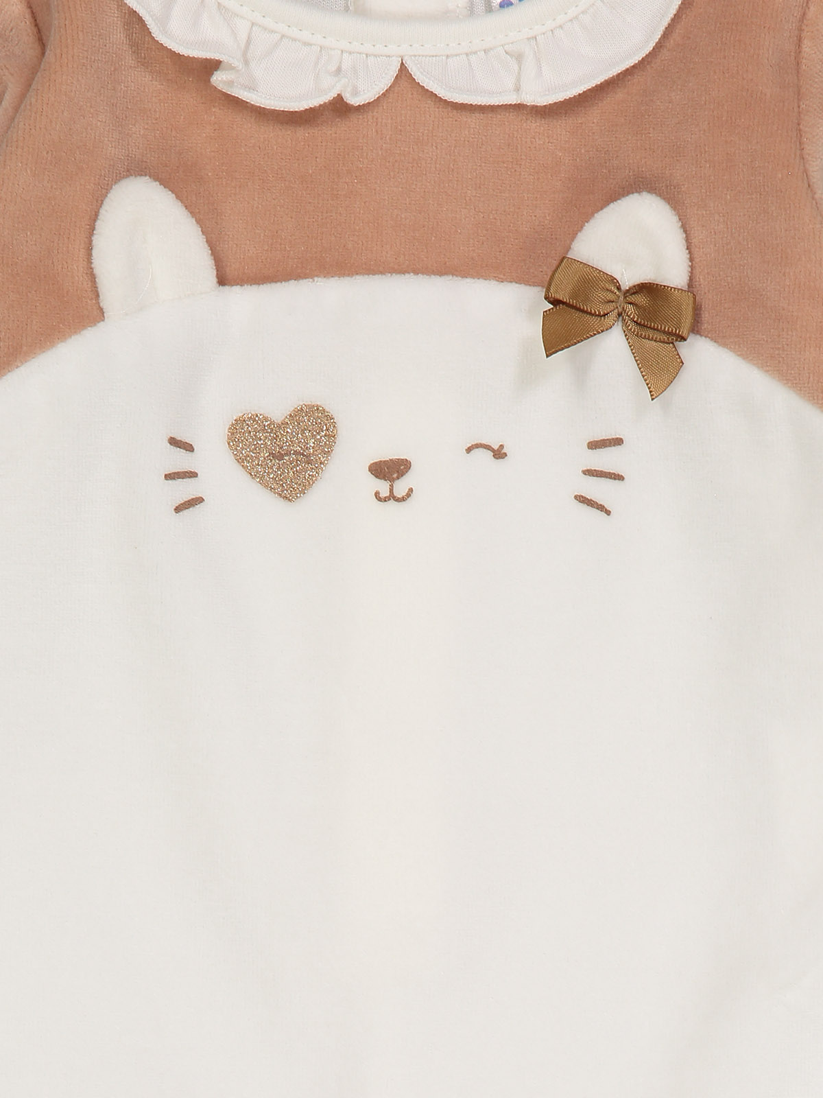 Tutina neonata in morbida ciniglia, taglio sul davanti, dolce stampa musetto con glitter e orecchie 3D, per una maggiore femminilità impreziosita da fiocco in raso. Apertura sul dietro ed entrogamba con bottoni a pressione per agevolarne l’indosso. Ideale in qualsiasi occasione.