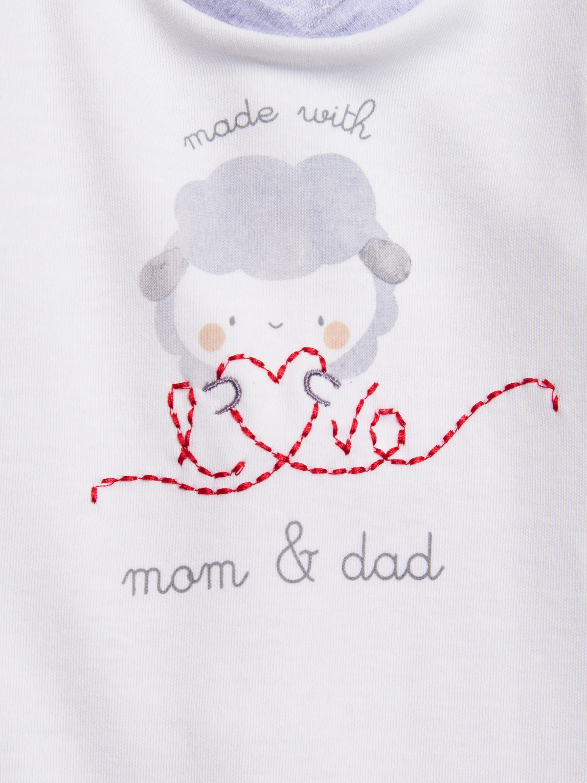 Tutina in caldo cotone bicolore. La vestibilità è Morbida e pratica grazie a bottoni a pressione sul retro e sul cavallo. Il davanti presenta una dolce grafica stampata e ricamata. Questo pigiamino fa parte del corredino composto da tutti gli articoli indispensabili per il tuo neonato.