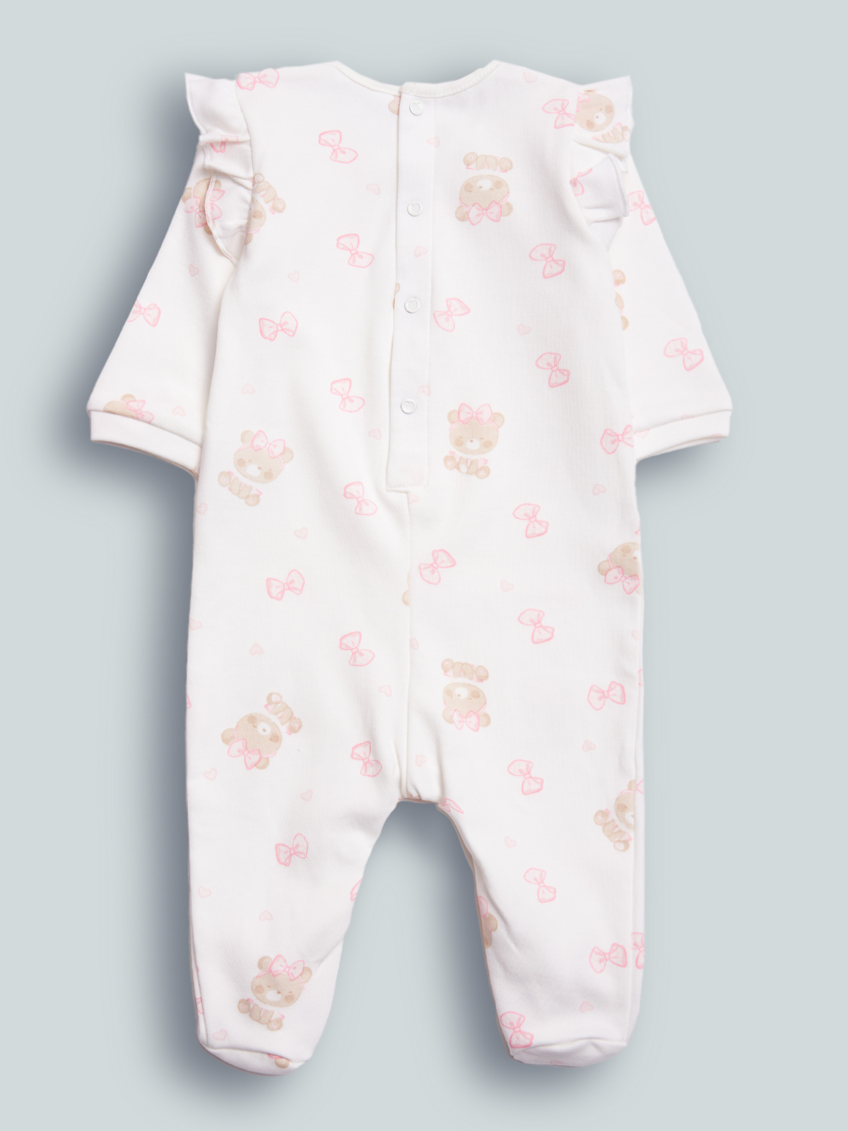 Tutina in caldo cotone stampato fantasia, Manica lunga, apertura dietro ed entrogamba con bottoni a pressione per agevolarne l’indosso. Tenera stampa glitter davanti. Un capo funzionale ed alla Moda, che non può Mancare nell’armadio delle vostre neonate.