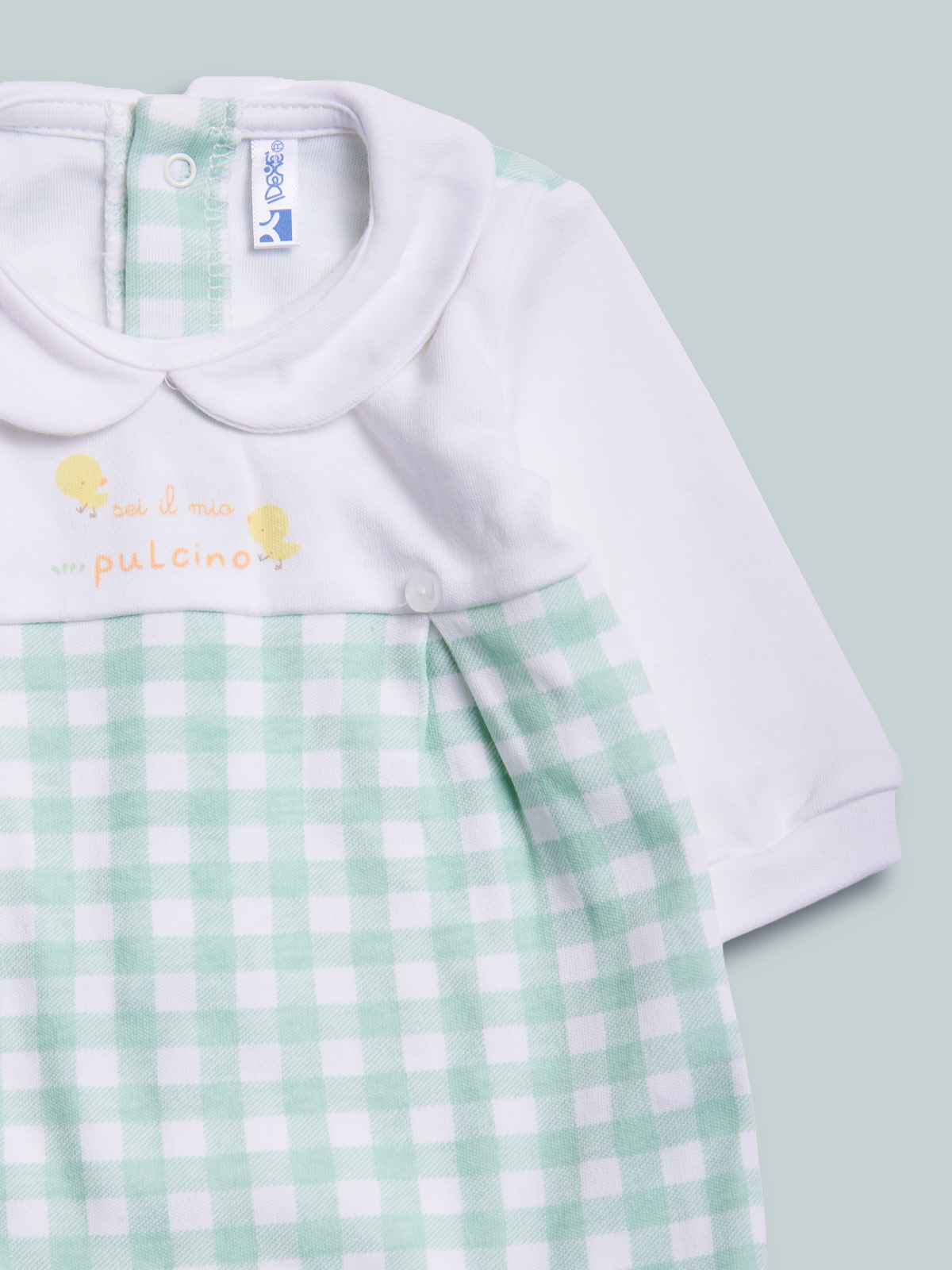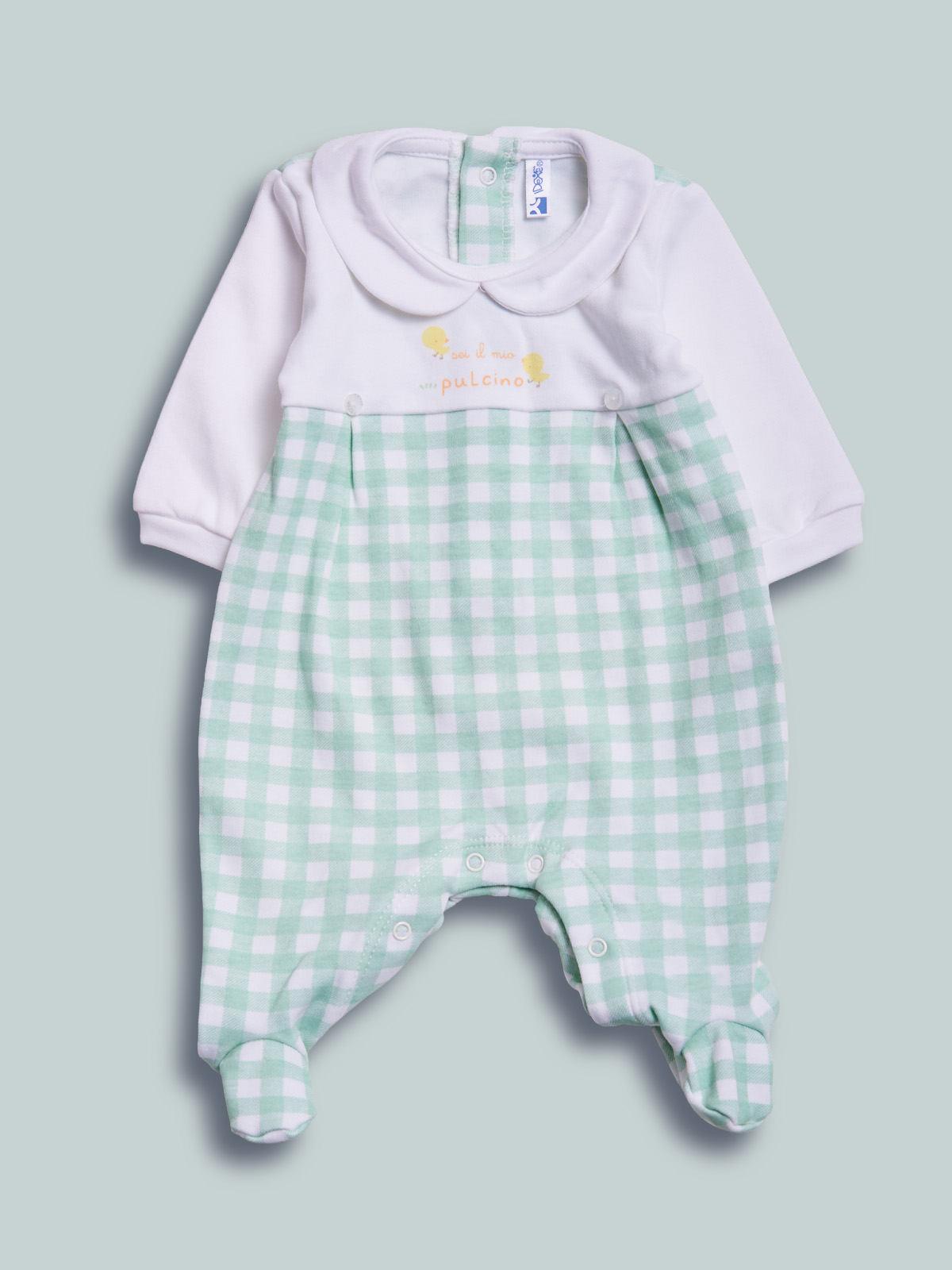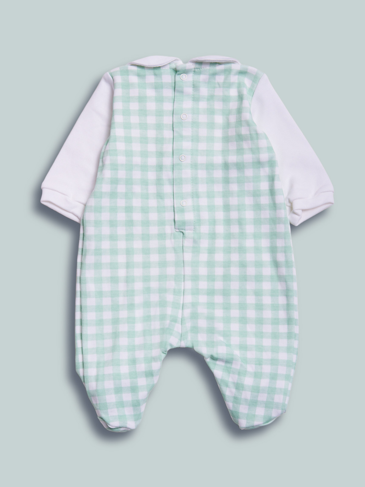 Tutina manica lunga in caldo cotone stampato vichy, riproposto su altri articoli della collezione, collo rotondo. Apertura dietro ed entrogamba con bottoni a pressione. Pigiamino perfetto per i primi giorni di vita.