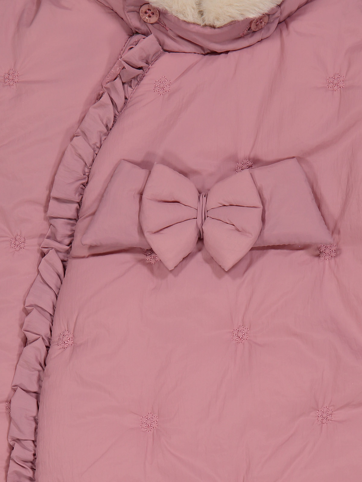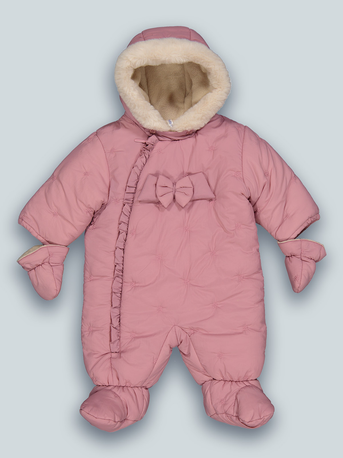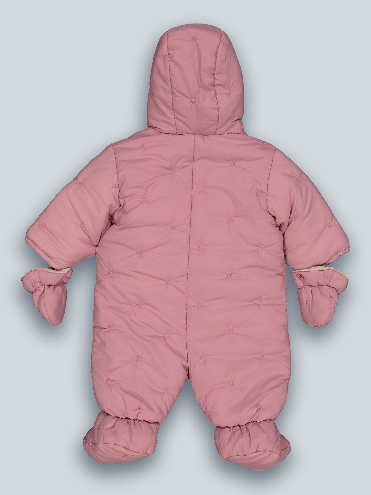 Tutone in nylon ricamato. Imbottito con morbida ovatta. Fodera in micropile materiale morbido e caldo. Apertura laterale con zip per maggiore praticità. Moffole staccabili. Questo tutone fa parte del corredino composto da tutti gli articoli indispensabili per la tua neonata.