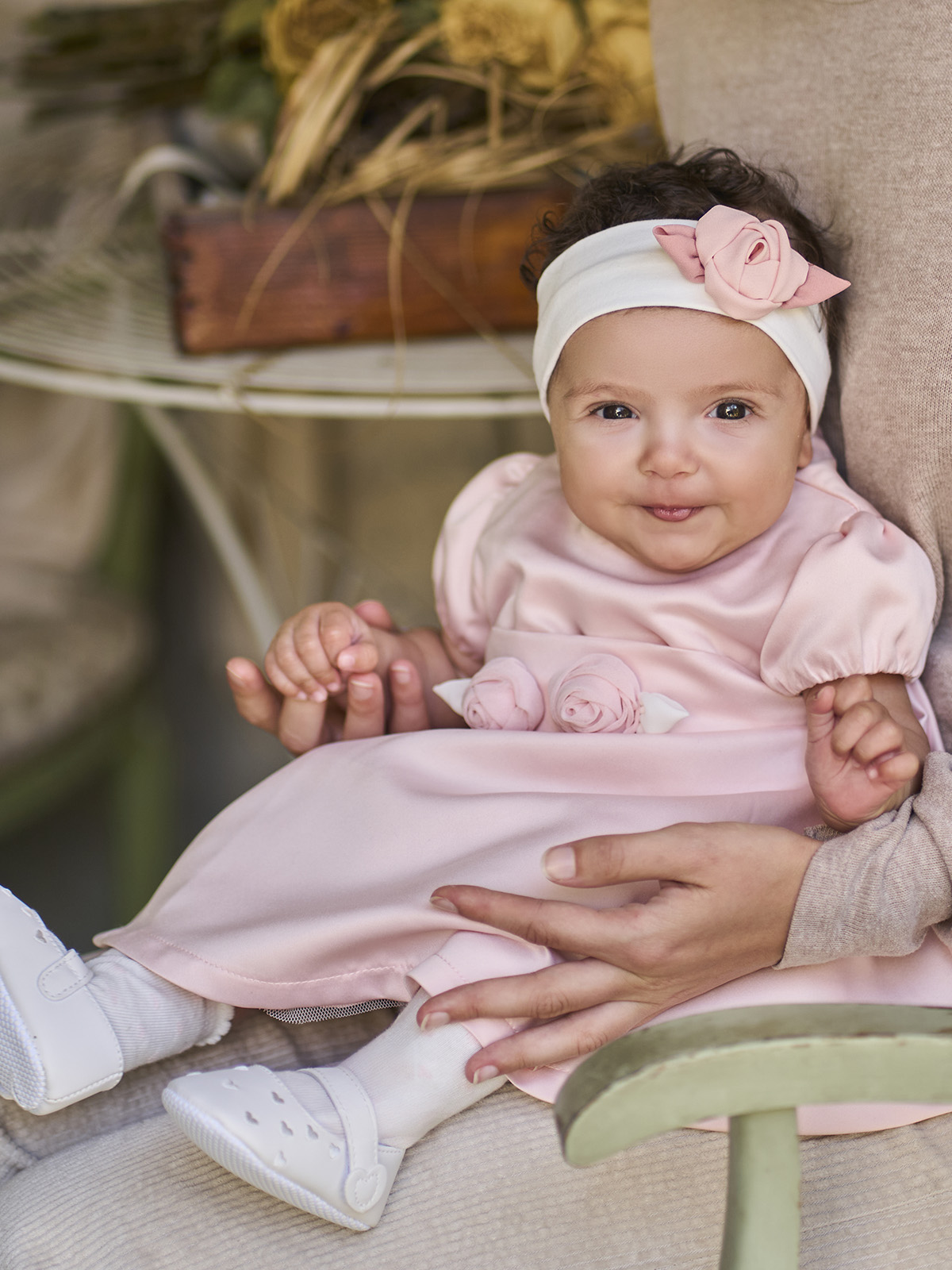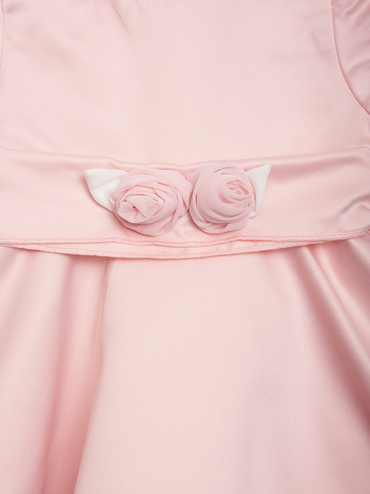 Vestito in raso lucido, Manica corta. Foderato internamente in Morbida Mussola di cotone. Sfiziosi fiori su fusciacca donano un valore aggiunto al capo. Taglio in vita per Maggiore ampiezza ed una caduta elegante. Pratico da indossare grazie all’apertura sul dietro con zip. Ideale da abbinare ai collant della collezione. Un vestito da vera principessa, ideale per le grandi occasioni.
