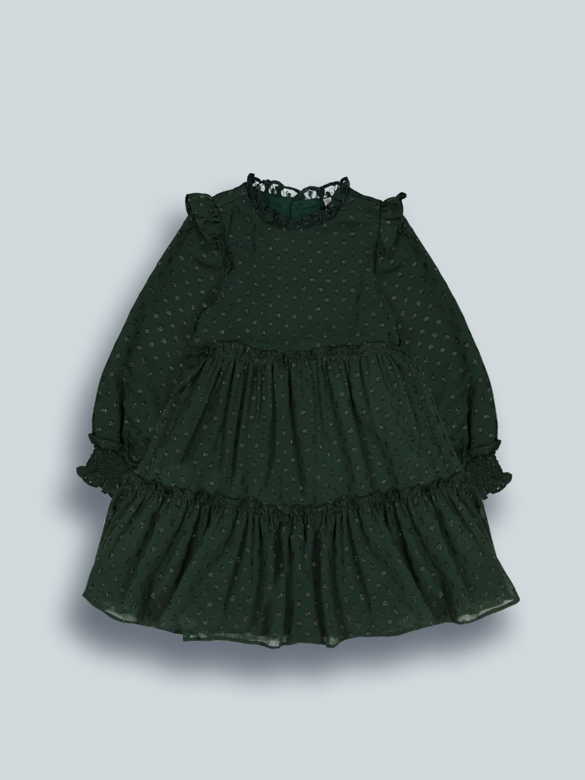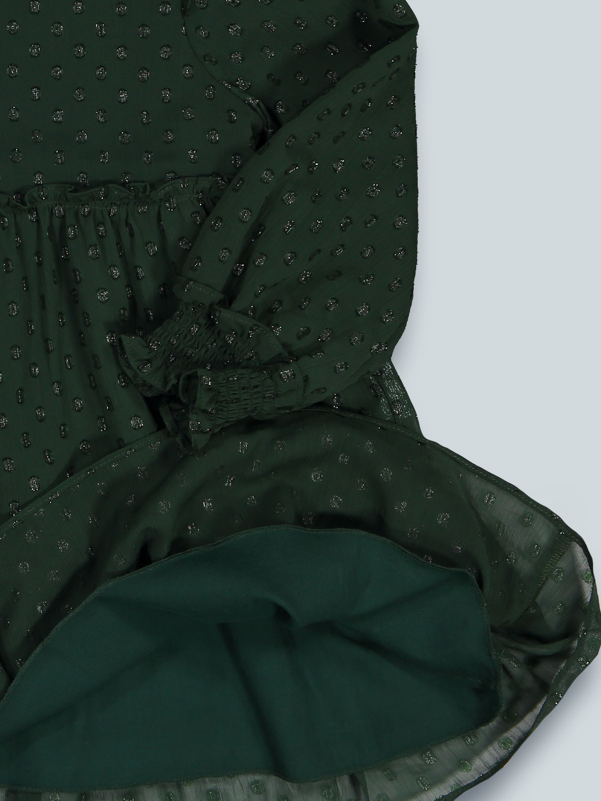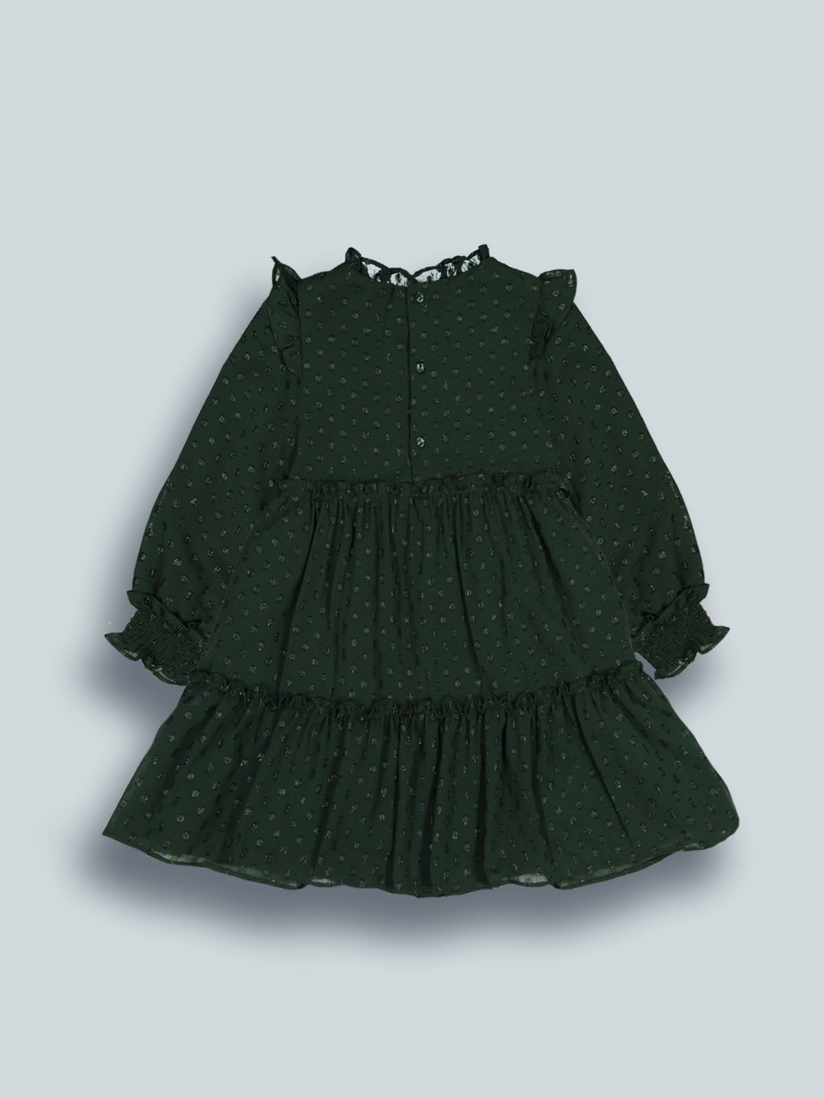 Vesttito ampio manica lunga in morbido plumetise foderato in morbida e calda tela. Dettaglio rouches al collo e alle maniche. Un capo elegante con dettagli chic, ideale da indossare nel periodo delle feste.