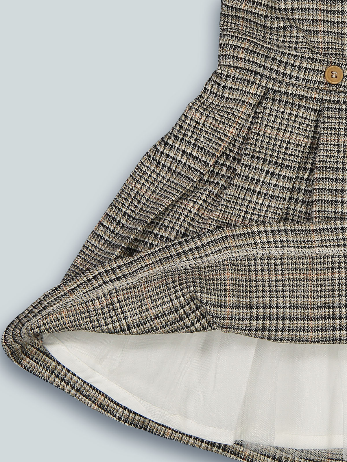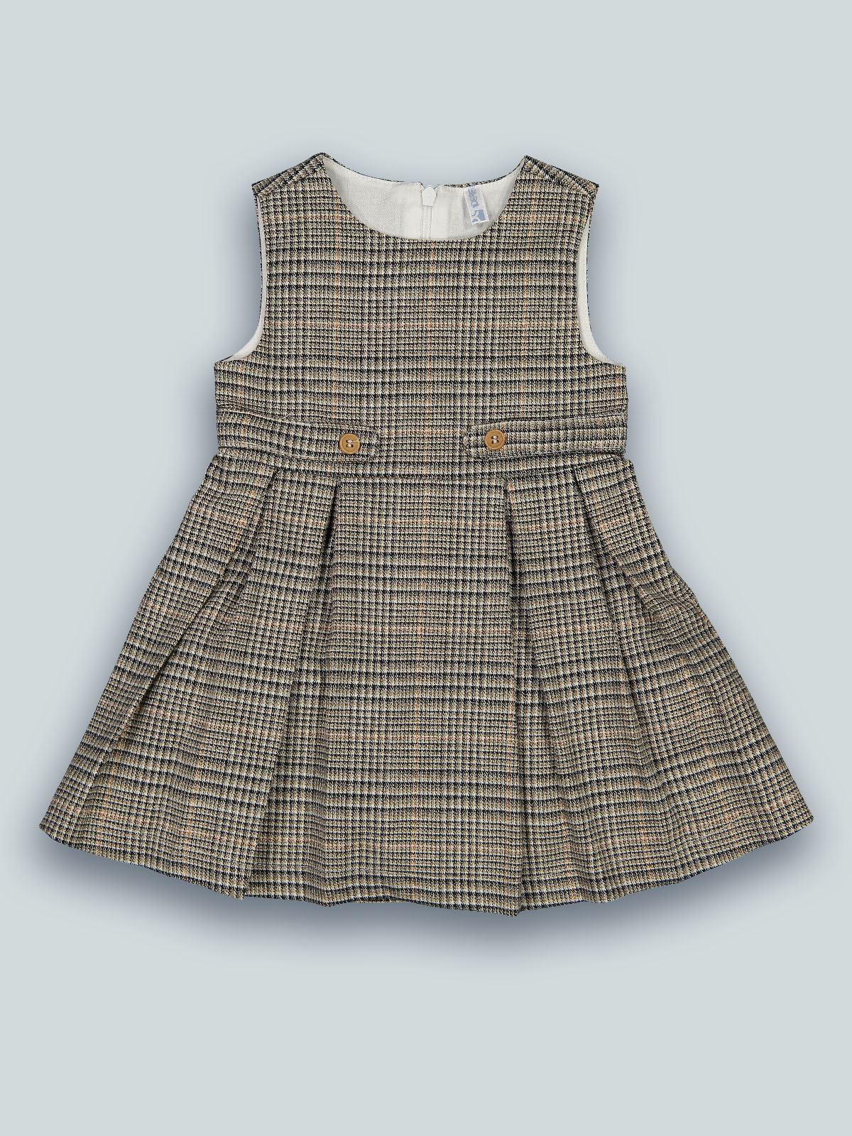 Vestito smanicato con pieghe in morbida flanella scozzese pratico da indossare grazie all’apertura sul dietro con zip. Foderato internamente in tessuto di cotone. Motivo in vita con bottoni effetto legno per ancora più femminilità. Un capo elegante ideale per il periodo delle feste e non solo.
