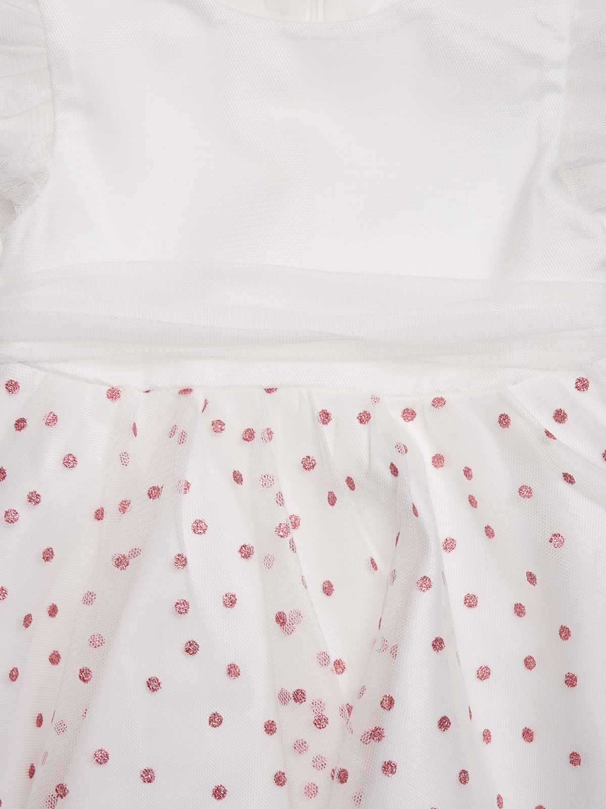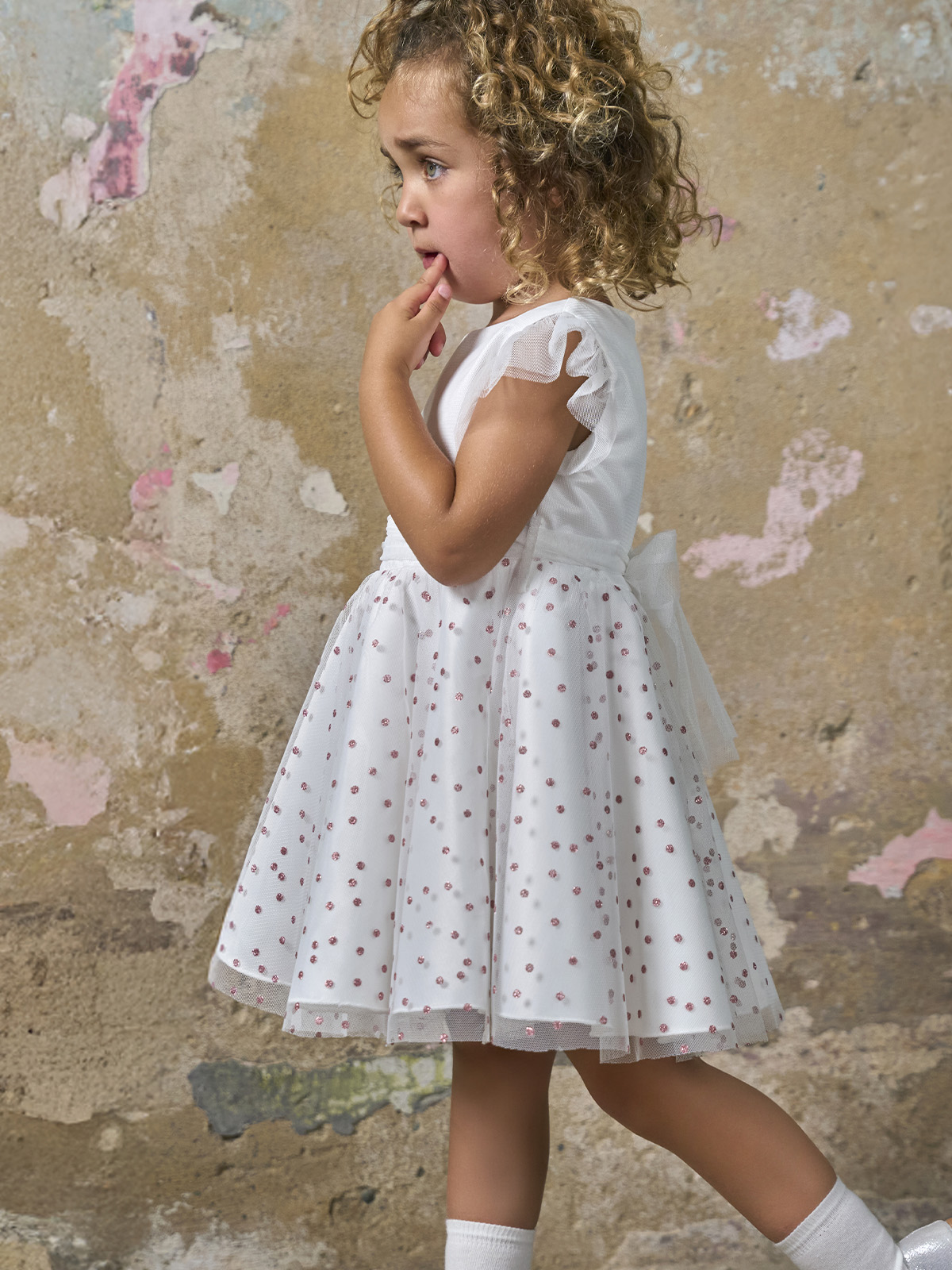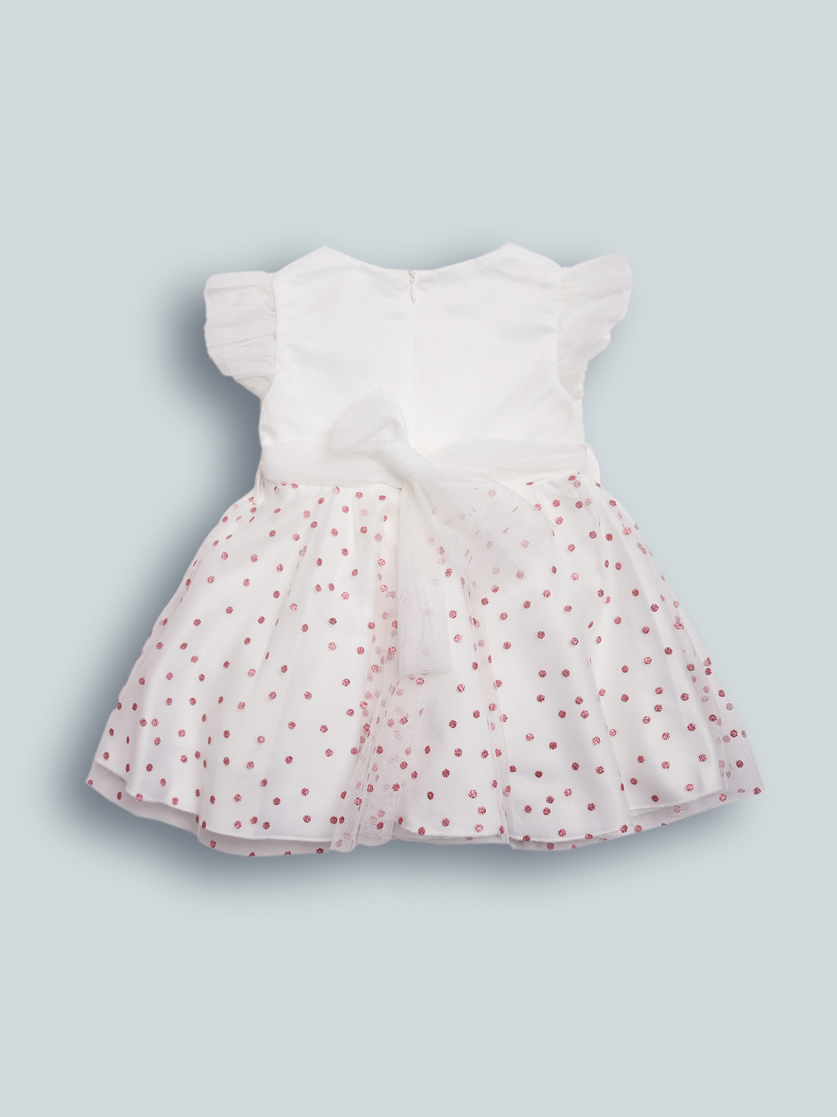 Vestito Manica corta in Morbido tulle tinta unita per il coprino e fantasia pois per la parte della gonna. Cinturina staccabile in tulle per Maggiore femminilità. Foderato internamente in Morbida Mussola di cotone. Taglio in vita con arricciatura per Maggiore ampiezza ed una caduta elegante. Pratico da indossare grazie all’apertura sul dietro con zip. Ideale da abbinare ai collant della collezione. Il capo perfetto per le grandi occasioni.